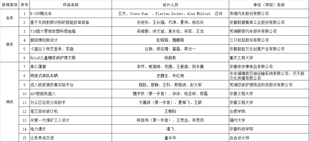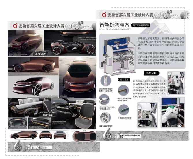 最終,來自奇瑞汽車的E-IUV概念車(概念設(shè)計)與安徽聯(lián)盟模具工業(yè)有限公司的基于無線射頻識別的智能折彎裝備( 實(shí)物產(chǎn)品)榮獲本次大賽金獎,從設(shè)計理念、產(chǎn)品外形、先進(jìn)技術(shù)在產(chǎn)品中的應(yīng)用以及解決行業(yè)痛點(diǎn)等關(guān)鍵問題上,以上作品在行業(yè)中均處于領(lǐng)先水平。同時,來自順榮股份、三只松鼠、美的冰箱、中車龐巴迪(蕪湖)、安徽工程大學(xué)、安徽工業(yè)大學(xué)等企業(yè)、高校投稿作品也在本次大賽中取得了優(yōu)異的成績。